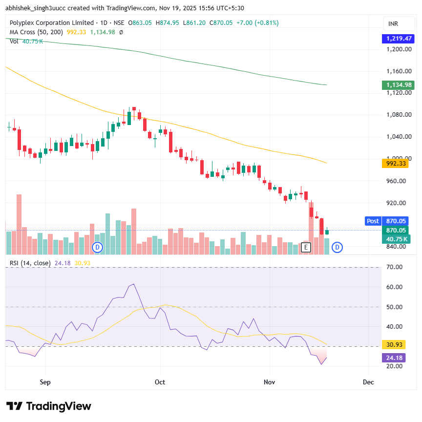 With a market capitalisation of Rs. 2,741 crores on Wednesday, the stock closed at Rs 873 apiece, with an RSI of 24.18, indicating that it is in the oversold zone, offering the potential for an upside bounce.