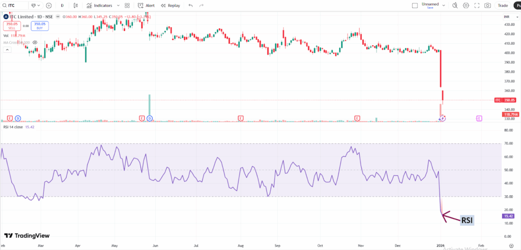 With a market capitalization of Rs. 4,38,701.53 crores on Friday, the stock closed at Rs. 350.15, with an RSI of 15.42, indicating that it is in the oversold zone, offering the potential for an upside bounce.