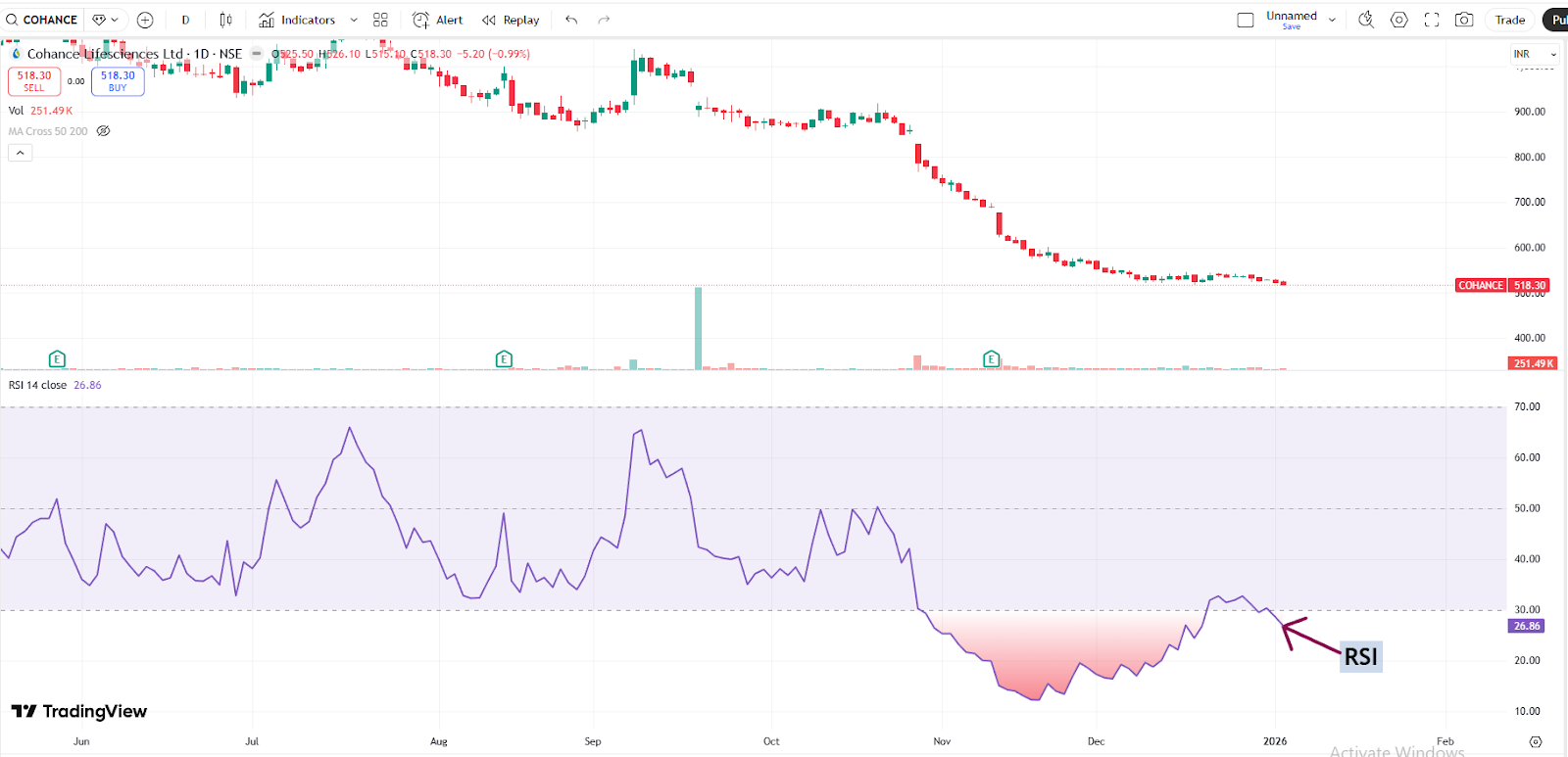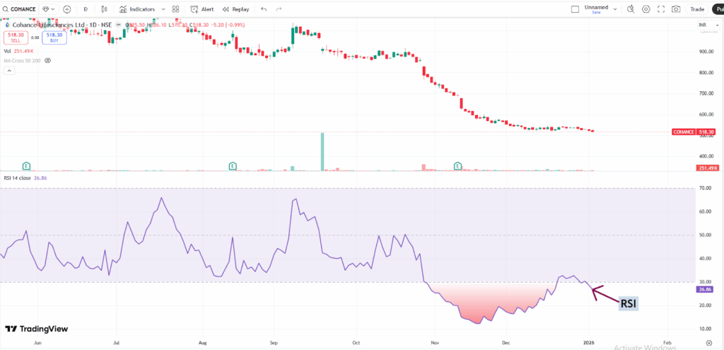 With a market capitalization of Rs. 19,784.46 crores on Friday, the stock closed at Rs. 517.15, with an RSI of 26.86, indicating that it is in the oversold zone, offering the potential for an upside bounce.