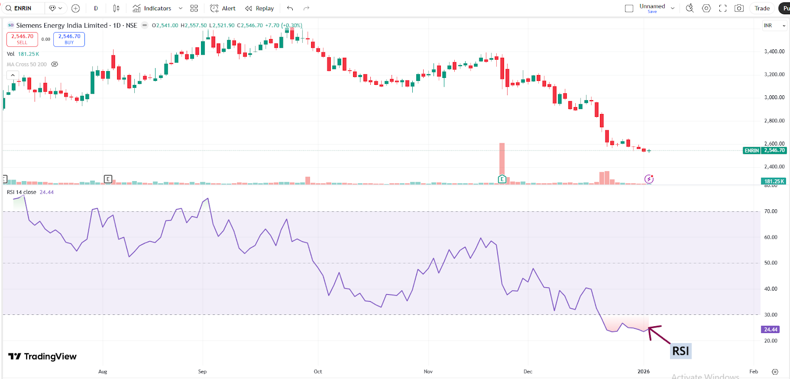 With a market capitalization of Rs. 90,573.91 crores on Friday, the stock closed at Rs. 2,543.35, with an RSI of 24.44, indicating that it is in the oversold zone, offering the potential for an upside bounce.
