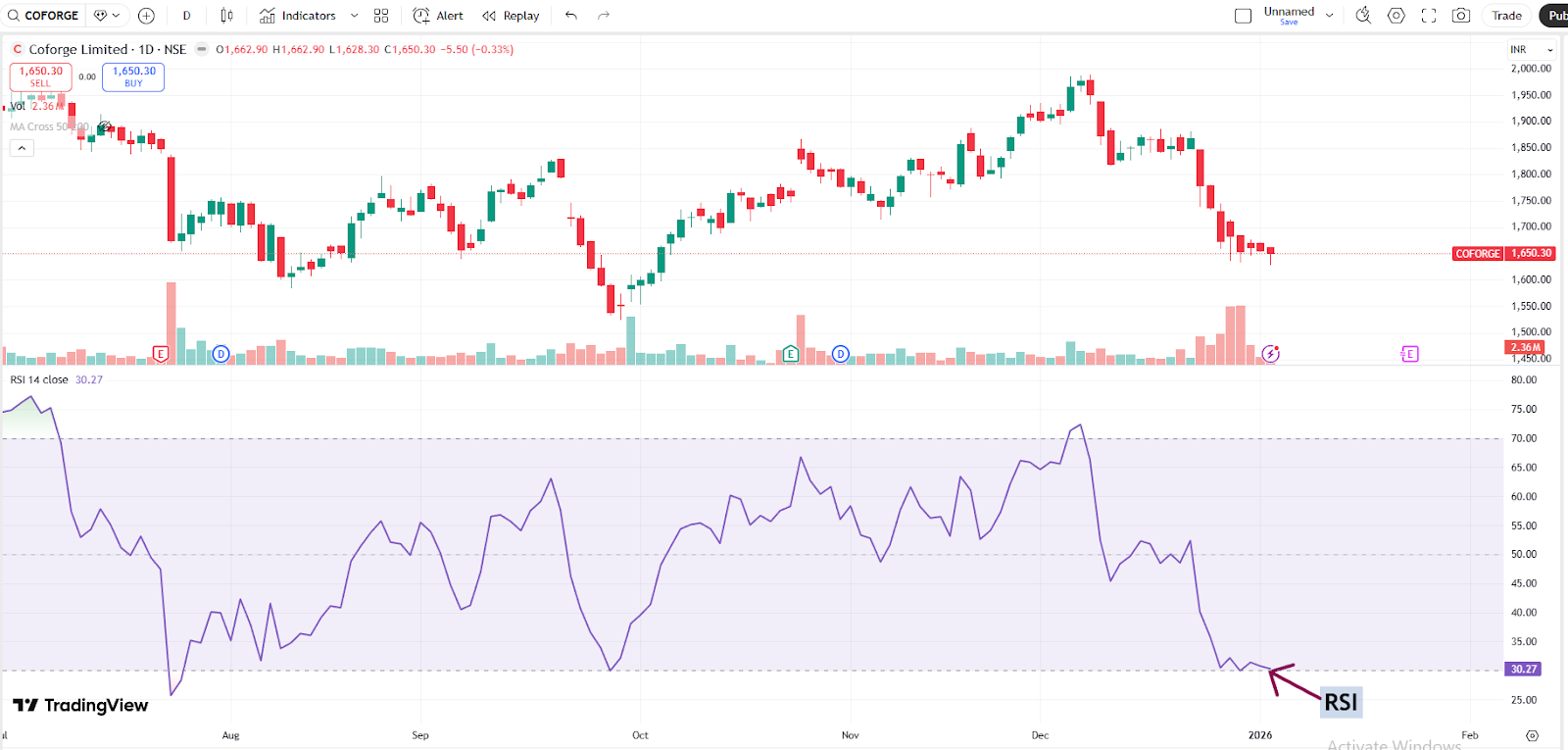 With a market capitalization of Rs. 55,328.80 crores on Friday, the stock closed at Rs. 1,651.40, with an RSI of 30.27 indicating that it is in the oversold zone, offering the potential for an upside bounce.