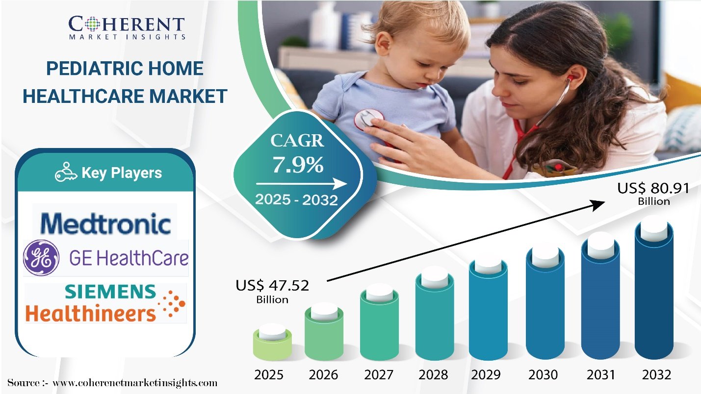 Burlingame, CA, Sept. 17, 2025 (GLOBE NEWSWIRE) — According to Coherent Market Insights, The Global Pediatric Home Healthcare Market is estimated to be valued at USD 47.52 Bn in 2025 and is expected to reach USD 80.91 Bn by 2032, exhibiting a compound annual growth rate (CAGR) of 7.9% from 2025 to 2032. This substantial growth is fueled by rising demand for specialized pediatric home care services, supported by advances in medical technology and the expanding population of children requiring chronic and long-term care.