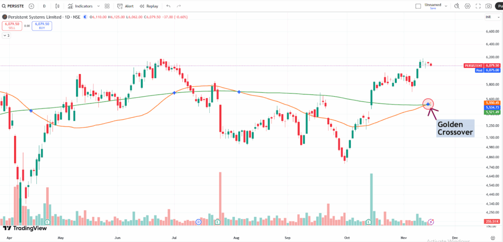The golden crossover took place on November 17, 2025, at a price of Rs. 5,534.73 with low volumes of 239.27 K. The stock closed at Rs. 6,075 in Tuesday’s session, reflecting upto a 1 percent decline since the crossover.