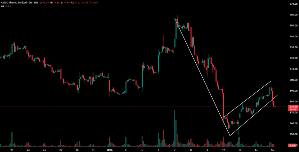 Natco Pharma, after a prolonged downtrend and a brief corrective uptrend, has formed an inverted flag and pole pattern on the 30-minute timeframe, indicating potential bearish momentum.