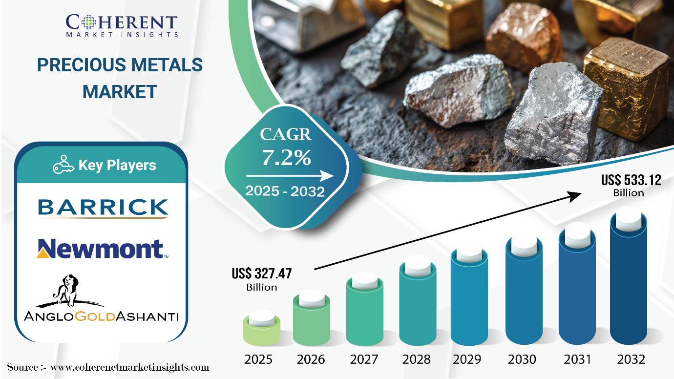 • According to Coherent Market Insights (CMI), the global precious metals market size is forecast to expand from USD 327.47 Bn in 2025 to USD 533.12 Bn by 2032, registering a CAGR of 7.2% throughout the forecast period.