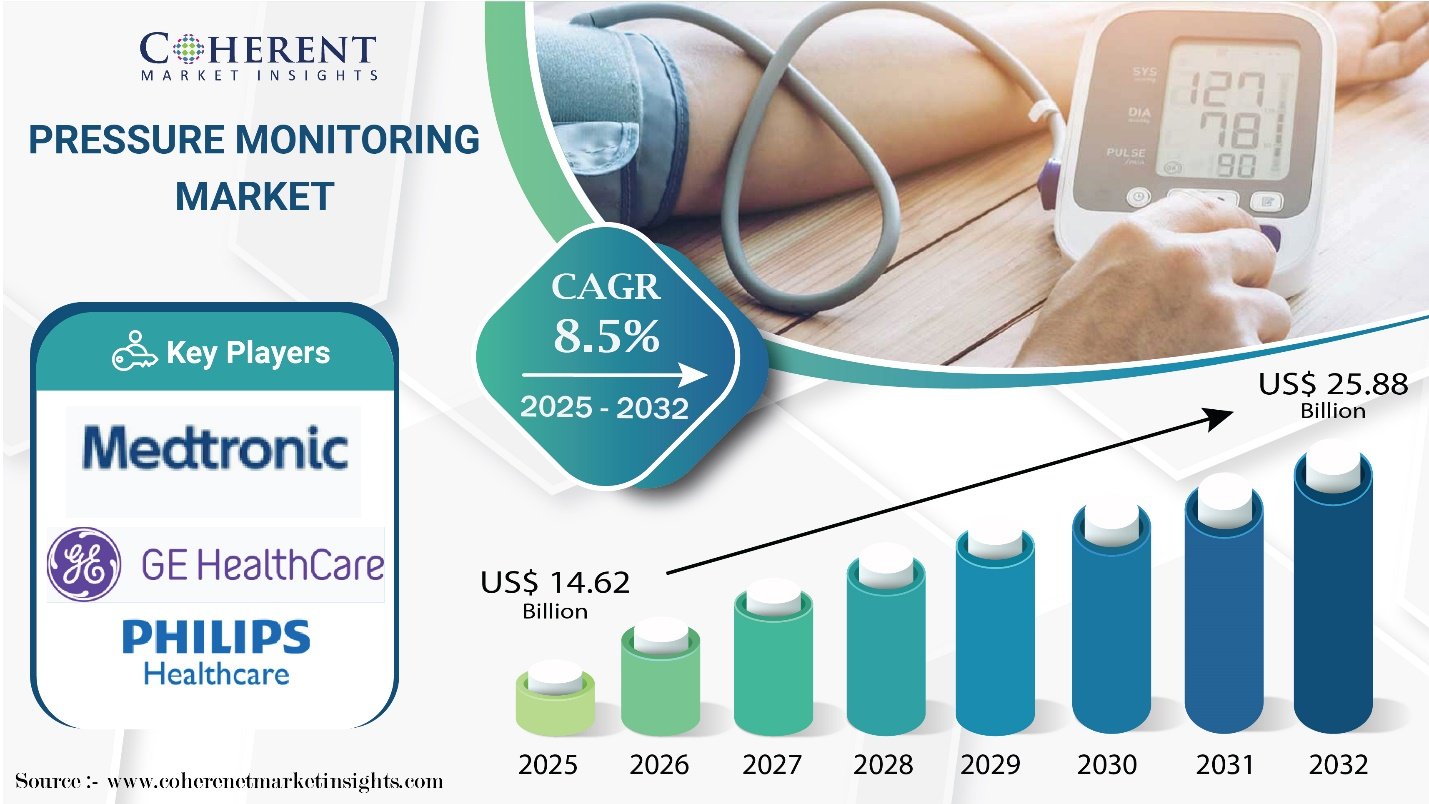 Burlingame, CA, Sept. 17, 2025 (GLOBE NEWSWIRE) — The Global Pressure Monitoring Market is estimated to be valued at USD 14.62 Bn in 2025 and is expected to reach USD 25.88 Bn by 2032, exhibiting a compound annual growth rate (CAGR) of 8.5% from 2025 to 2032. This strong growth is driven by rising demand for precise and reliable pressure monitoring solutions across healthcare, automotive, and manufacturing industries. Moreover, the adoption of advanced technologies and stricter safety regulations are further accelerating market expansion.