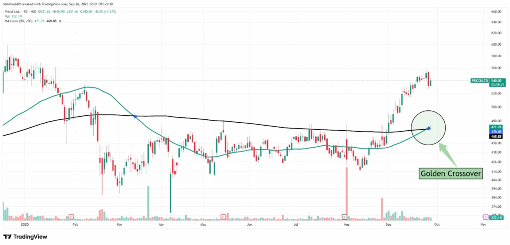 The golden crossover took place on September 25, 2025, at a price of Rs. 470 with decent volumes of 337.75 K shares. The stock closed at Rs. 540 in Friday’s session, reflecting a 1.57 percent increase in the intraday trade.