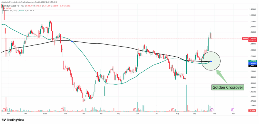 The golden crossover took place on September 25, 2025, at a price of Rs. 1,466 with decent volumes of 78.34 K shares. The stock closed at Rs. 1,713.70 in Friday’s session, reflecting a 2.76 percent decrease in the intraday trade.
