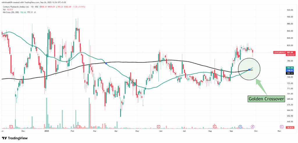 The golden crossover took place on September 23, 2025, at a price of Rs. 758.01 with decent volumes of 43.28 K shares. The stock closed at Rs. 798.85 in Friday’s session, reflecting a 1.30 percent decrease in the intraday trade.