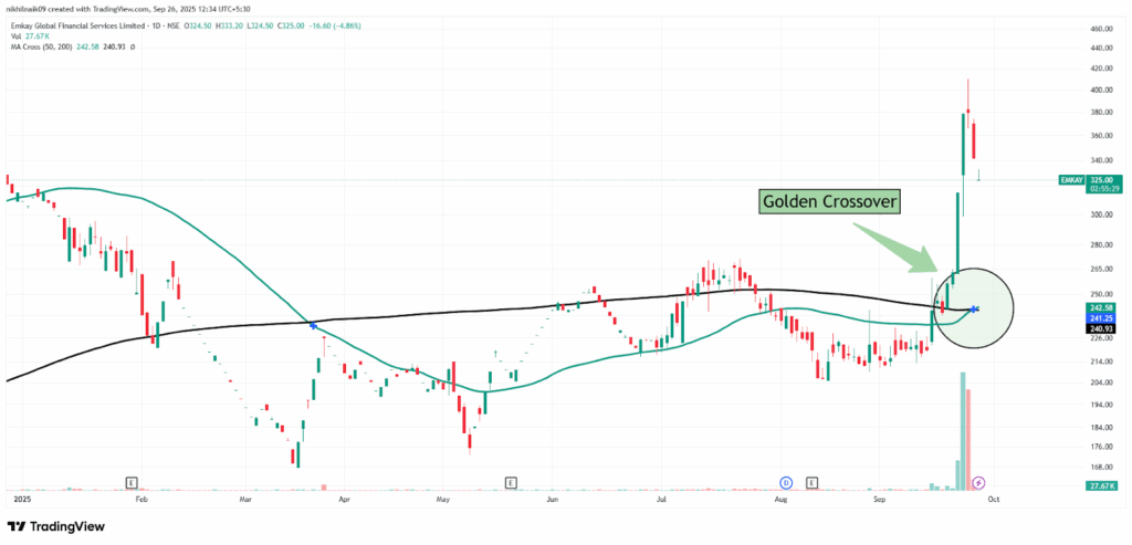 The golden crossover took place on September 25, 2025, at a price of Rs. 241.25 with decent volumes of 292.97 K shares. The stock closed at Rs. 324.50 in Friday’s session, reflecting a 5 percent decrease in the intraday trade.