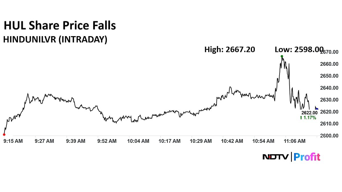 Hindustan Unilever Ltd. share price was trading 1.35% higher at Rs 2,629 apiece. The share price rose 2.91% to Rs 2,667 apiece earlier in the day.