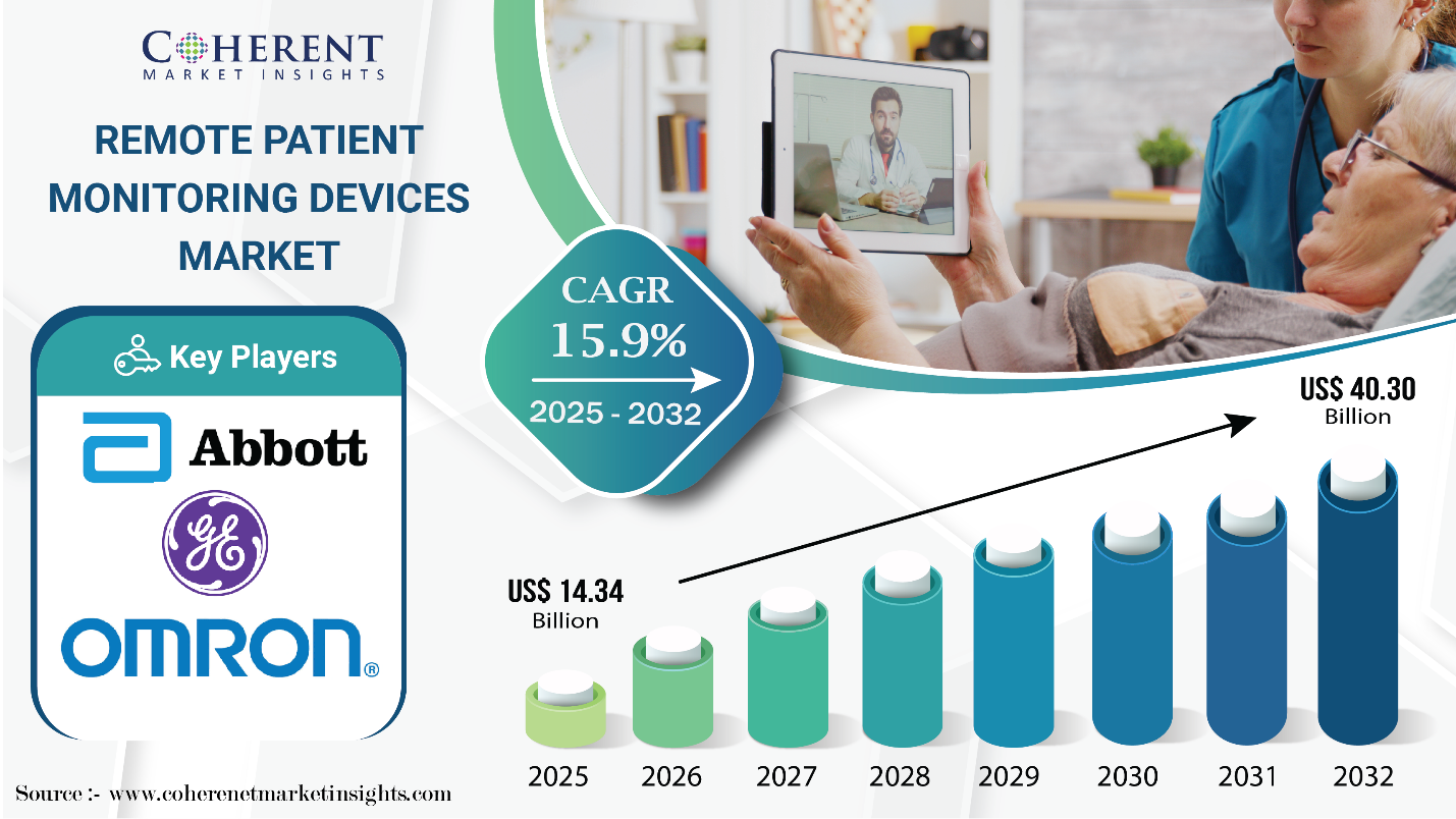 According to Coherent Market Insights (CMI), the global remote patient monitoring devices market size is slated to expand over 2.8X, from USD 14.34 Bn in 2025 to USD 40.34 Bn by 2032.