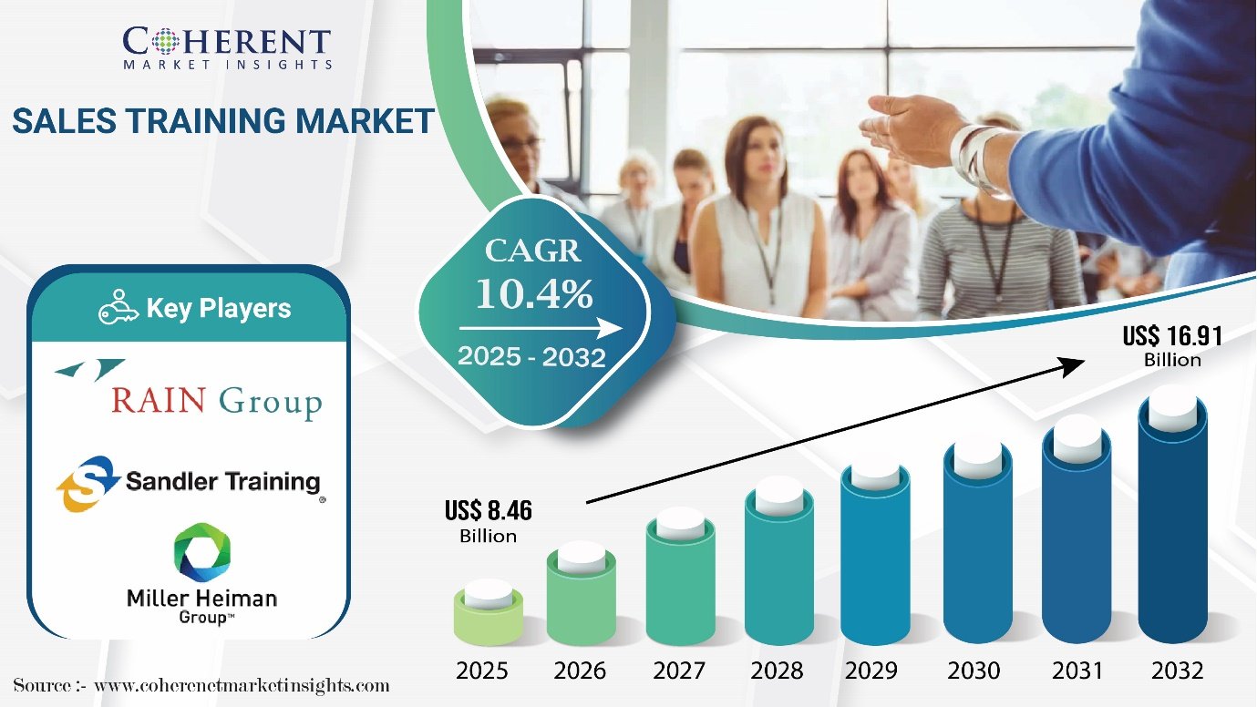 According to Coherent Market Insights (CMI), the global sales training market size is poised to double during the forecast period, increasing from USD 8.46 Bn in 2025 to USD 16.91 Bn by 2032.