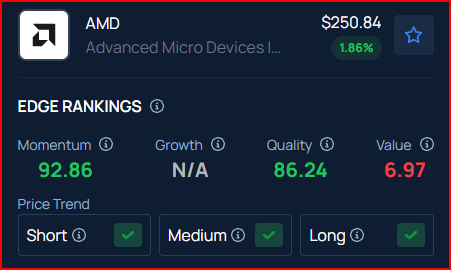 Benzinga’s Edge Rankings place AMD in the 92nd percentile for momentum and the 86th percentile for quality, reflecting its strong performance. Benzinga’s screener allows you to compare AMD’s performance with its peers.