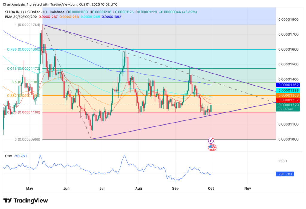 SHIB’s daily chart shows price respecting an ascending trendline that has guided action since June.