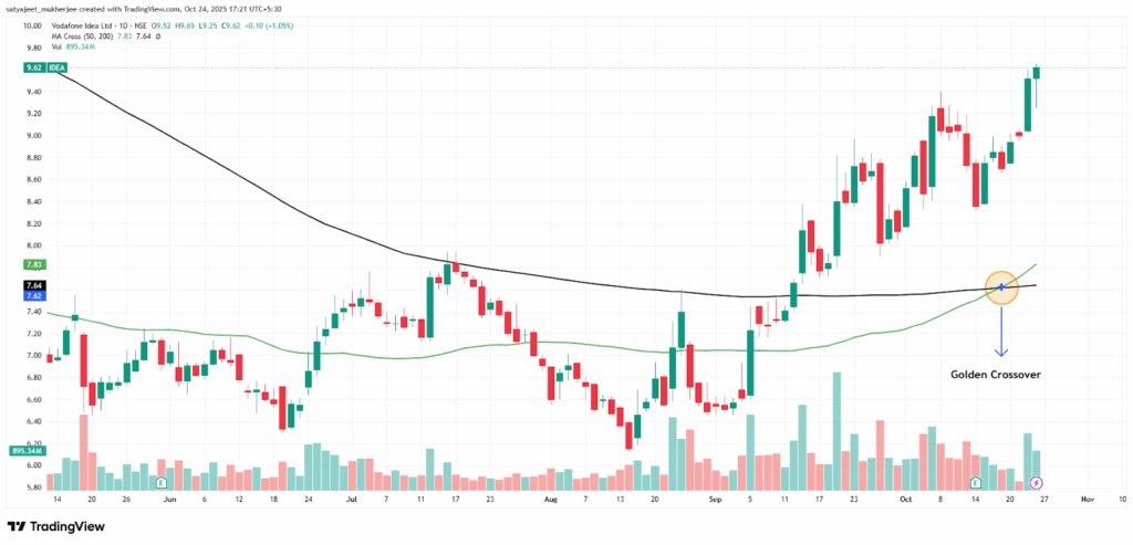 The golden crossover took place on October 17, 2025, at Rs. 7.62 with good volumes of 468.59 M. The stock closed at Rs. 9.63 in Friday’s session, reflecting a 1.16 percent increase in the intraday trade.