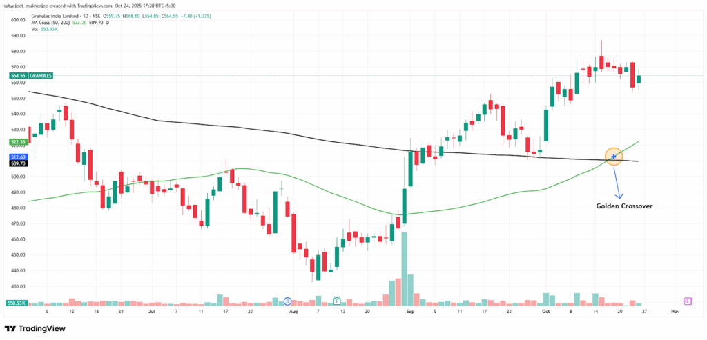 The golden crossover took place on October 17, 2025, at Rs. 512.60 with decent volumes of 727.22 K. The stock closed at Rs. 561.95 in Friday’s session, reflecting a 0.86 percent increase in the intraday trade.