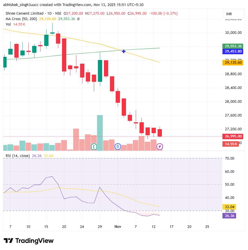 With a market capitalization of Rs. 97,377 crores on Thursday, the stock closed at Rs. 26,985 apiece, with an RSI of 26.36, indicating that it is in the oversold zone, offering the potential for an upside bounce.