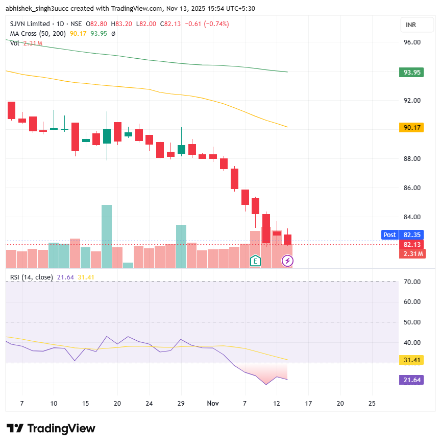 With a market capitalization of Rs. 32,264 crores on Thursday, the stock closed at Rs. 82.2 apiece, with an RSI of 21.64, indicating that it is in the oversold zone, offering the potential for an upside bounce.