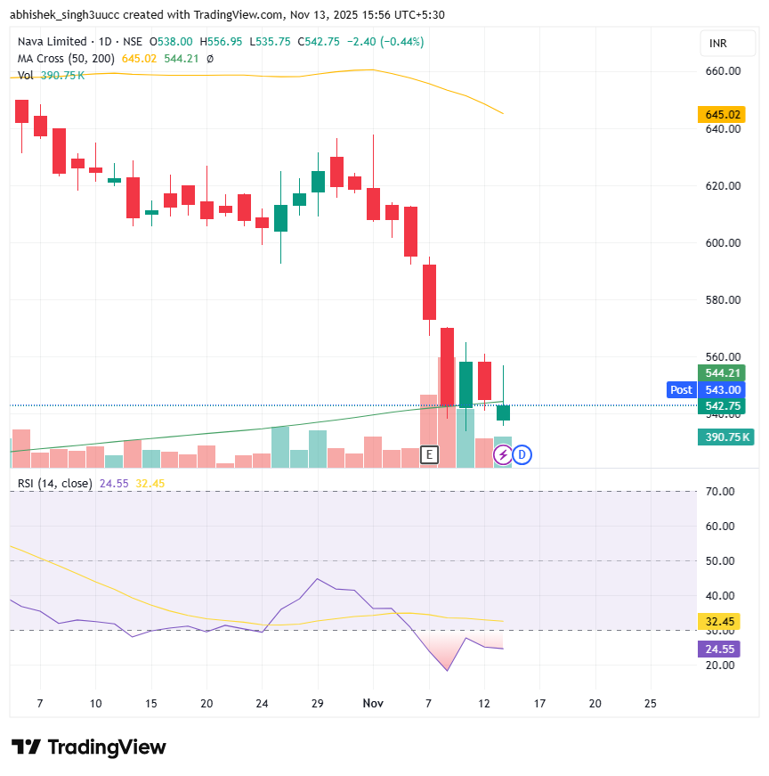With a market capitalization of Rs. 15,748 crores on Thursday, the stock closed at Rs. 543 apiece, with an RSI of 24.55, indicating that it is in the oversold zone, offering the potential for an upside bounce.