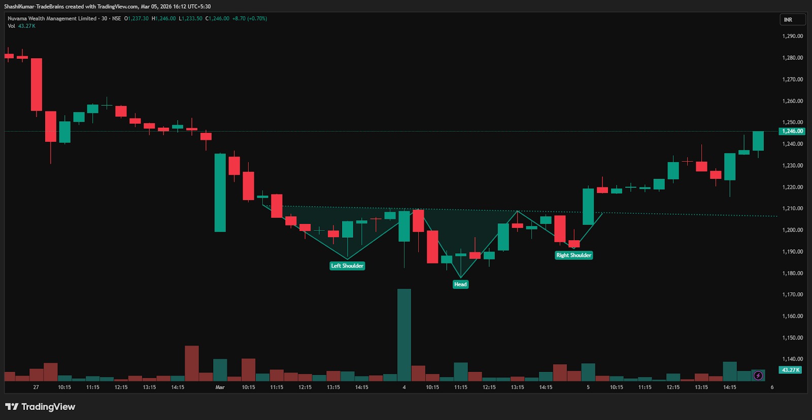 Synopsis: Nuvama Wealth Management Ltd has formed an inverted head-and-shoulders pattern on the 30-minute chart, indicating a potential near-term bullish reversal.
