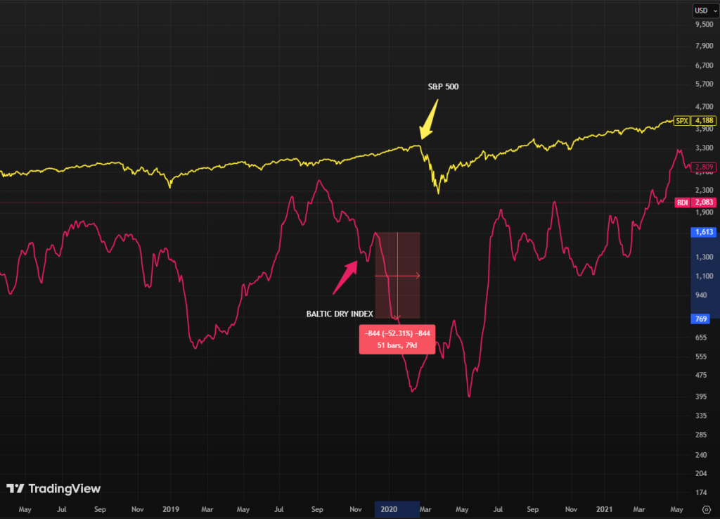 A similar pattern appeared during the Covid 19 crash. The first Covid cases were recorded as early as December 2019, and the Baltic Dry Index began declining in the early days of December. It went on to fall by around 50 percent before global markets crashed by late February due to lockdown announcements and major trade disruptions. While the stock market eventually bottomed on March 23, 2020, the Baltic Dry Index had already bottomed earlier by early February before starting to recover, again showing how freight markets moved ahead of equities.