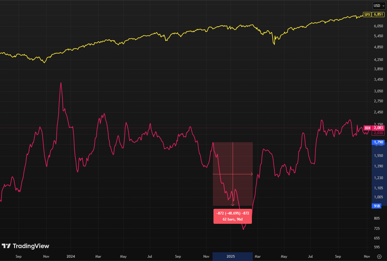 The 2025 Liberation crash also highlights how shipping markets reacted early. Commodity traders and shipping companies were among the first to see the impact of upcoming trade policies as China’s demand for iron ore fell due to a weakening property sector and front loading of exports ahead of the April 2 U.S. tariff deadline. Global markets crashed starting April 2, 2025 after U.S. President Donald Trump announced sweeping tariffs on what he called Liberation Day, triggering panic selling and marking the largest global market decline since the 2020 crash. The S&P 500 started showing cracks by mid February, but by that time the Baltic Dry Index had already declined by about 48 percent and had bottomed out by late January or early February, roughly two months before the S&P 500 reached its bottom.