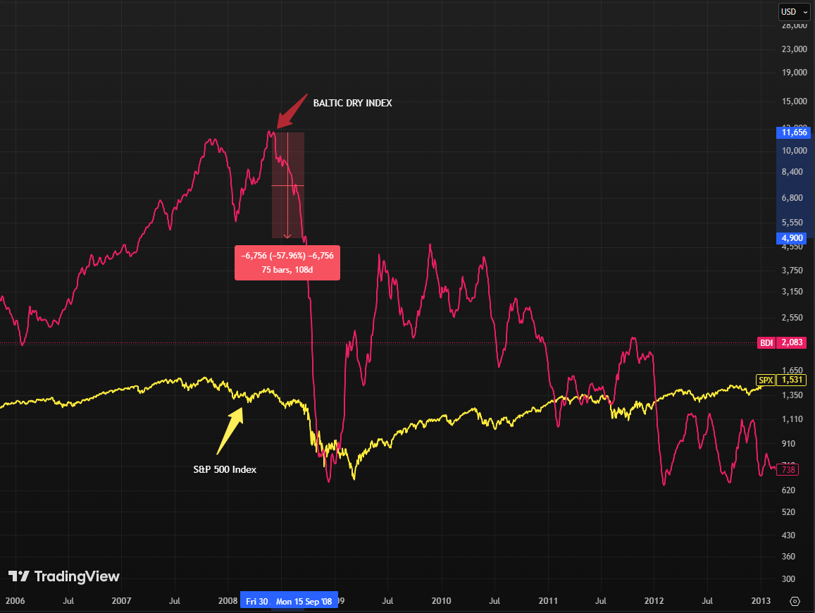 The Baltic Dry Index has shown its ability to move ahead of major economic downturns in several cycles. During the 2008 financial crisis, the crisis was widely marked from September 15, 2008, but the Baltic Dry Index had already peaked earlier on May 19, 2008. After that peak, the index declined sharply and fell about 50 to 60 percent before the September crisis date. It continued to fall further but started recovering by early December 2008, while the S&P 500 only began recovering later in early March 2009. This gap shows how shipping markets reacted months before equities reflected the slowdown.