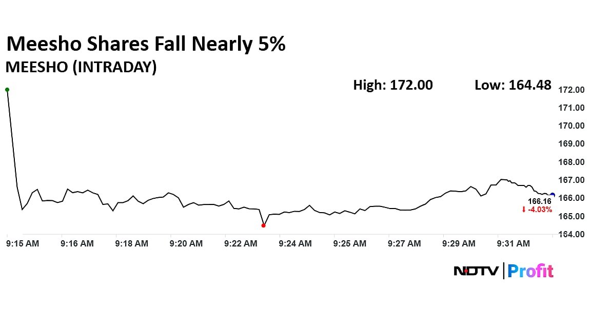 Meesho shares were in focus on Thursday after it extended decline for the third day. The scrip fell as much as 4.7% to Rs 465.30 apiece on Thursday, lowest level since Dec. 15. It pared gains to trade 3.09% lower at Rs 166.73 apiece, as of 9:31 a.m. This compares to a 0.30% decline in the NSE Nifty 50 Index.