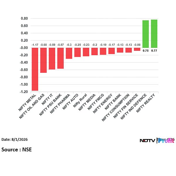 On NSE, 13 out of 15 sectors were in the red. Nifty Metal and Nifty Oil and Gas lead the decline, while Nifty Realty and Nifty Defence were the only sectors in the green.