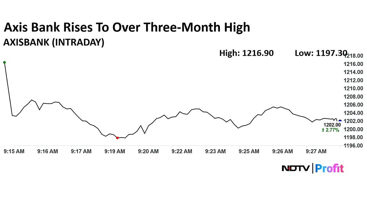 Axis Bank Ltd. share price rose 4.04% to Rs 1,216.90 apiece, the highest level since June 30. It was trading 2.89% higher at Rs 1,203.70 apiece as of 9:31 a.m.