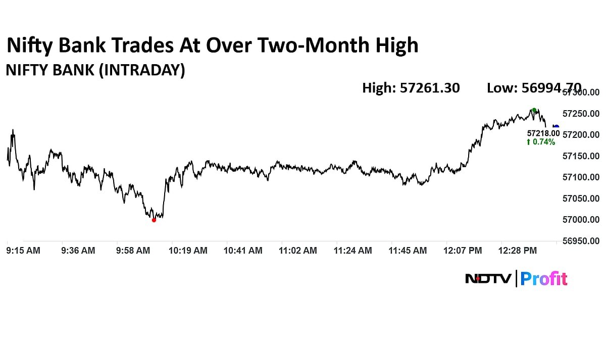 The NSE Nifty Bank rose 0.81% to Rs 57,261.30, the highest level since July 24. ICICI Bank Ltd., HDFC Bank Ltd., and Axis Bank Ltd. shares supported gains