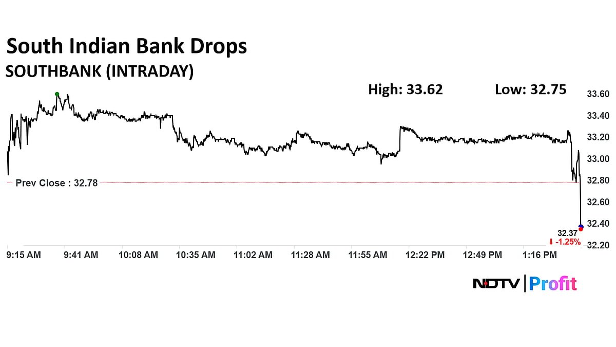 South Indian Bank share price declined 3.36% to Rs 32.75 apiece, the lowest level since Oct 10. It reported that its net interest income declined 8.3% on the year to Rs 809 crore versus Rs 882 crore.