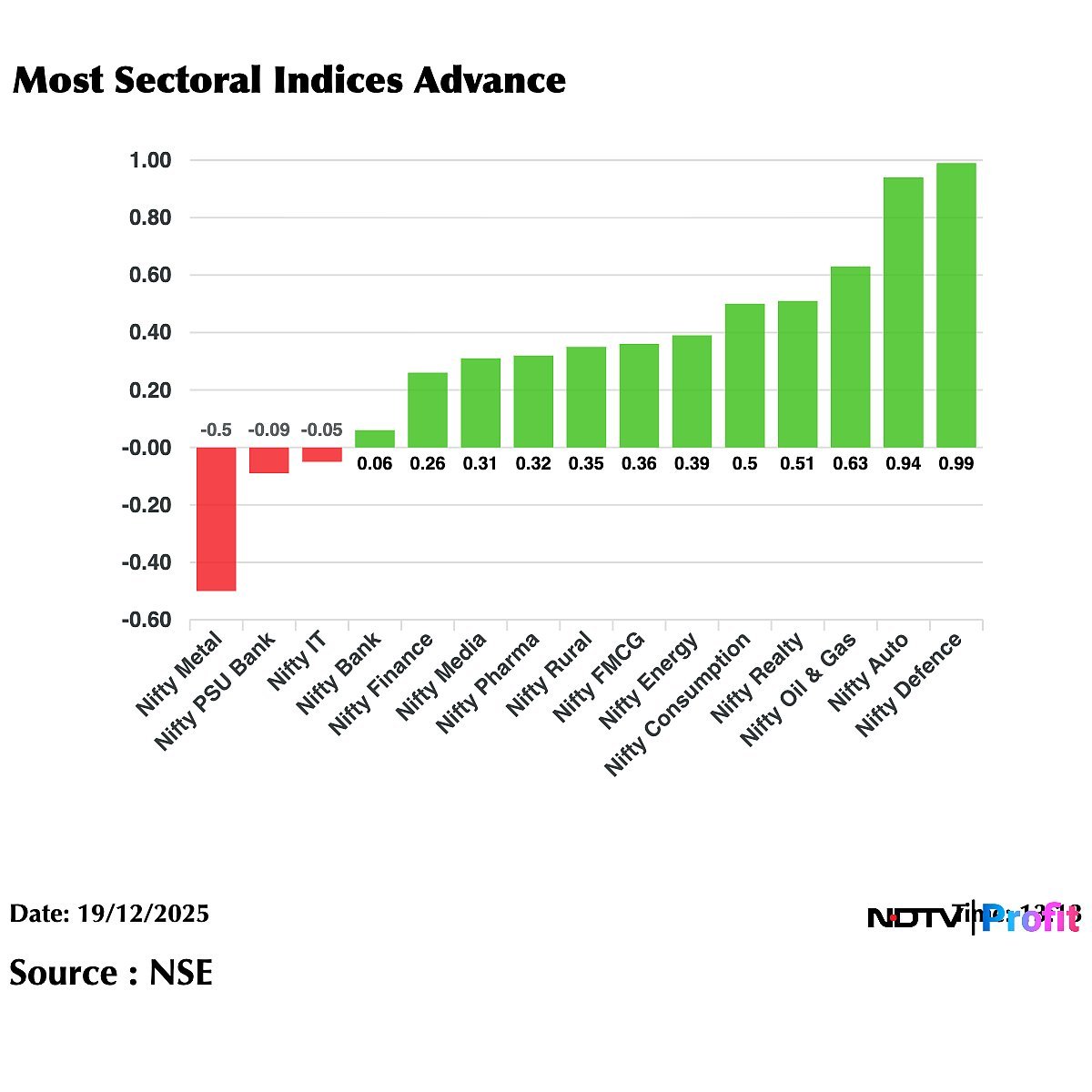 Sectoral indices were largely trading in the green, led by Nifty Defence and Auto.