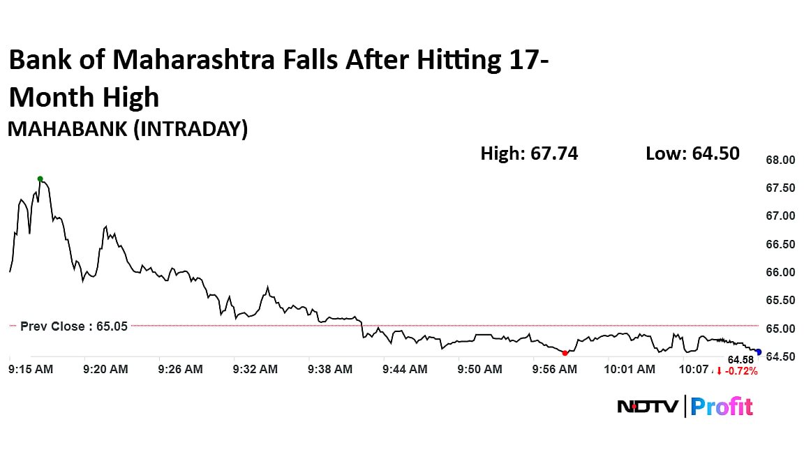 Bank of Maharashtra shares rose to hit 17-month high on Wednesday after it announced its third quarter results. The scrip rose as much as 4.14% to Rs 67.74 apiece on Wednesday, highest level since July 31, 2024. It pared gains to trade 0.61% lower at Rs 64.65 apiece, as of 10:10 a.m. This compares to a 0.11% decline in the NSE Nifty 50 Index.