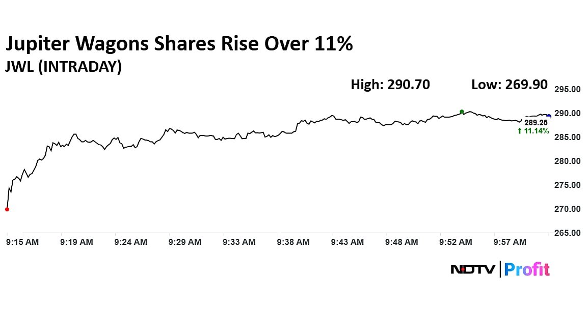 The shares of Jupiter Wagons rose as much as 11.24% to Rs 289.50 apiece on Monday, the highest level since Dec. 1. It pared gains to trade 10.72% higher at Rs 288.15 apiece, as of 10:02 a.m. This compares to a 0.65% advance in the NSE Nifty 50 Index.