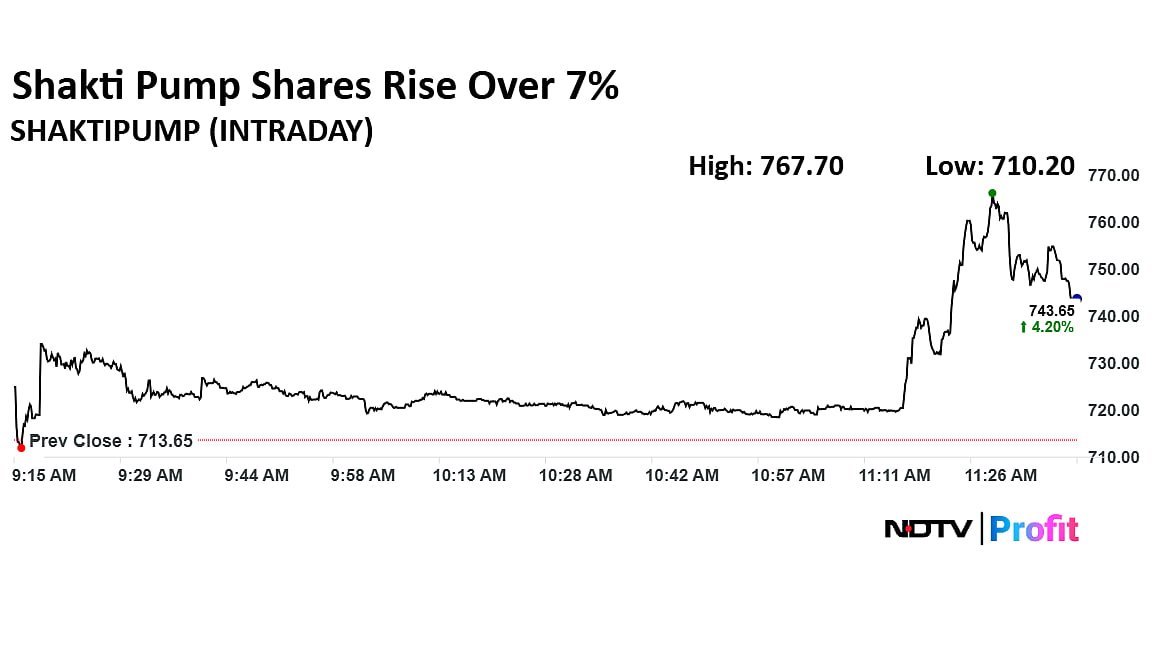 The shares of Shakti Pump rose over 7% after it gets letter of acceptance for Rs 357 crore order from Maharashtra State Electricity Distribution Co.