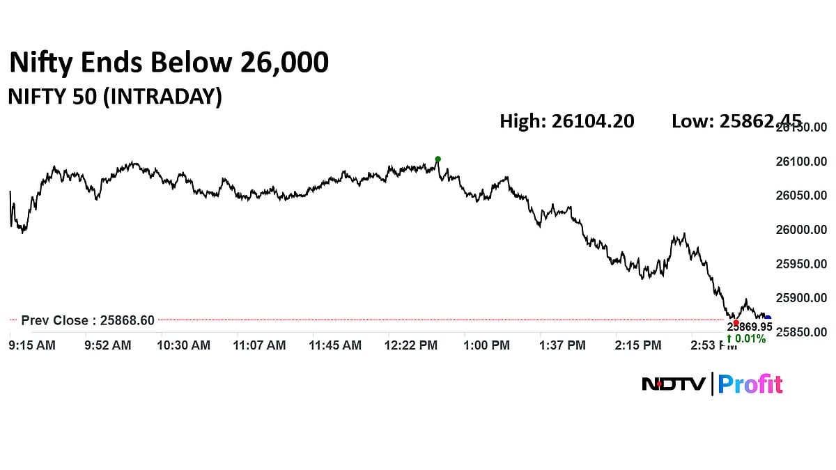 • Nifty 50 ends flat, closes below the crucial mark of 26,000