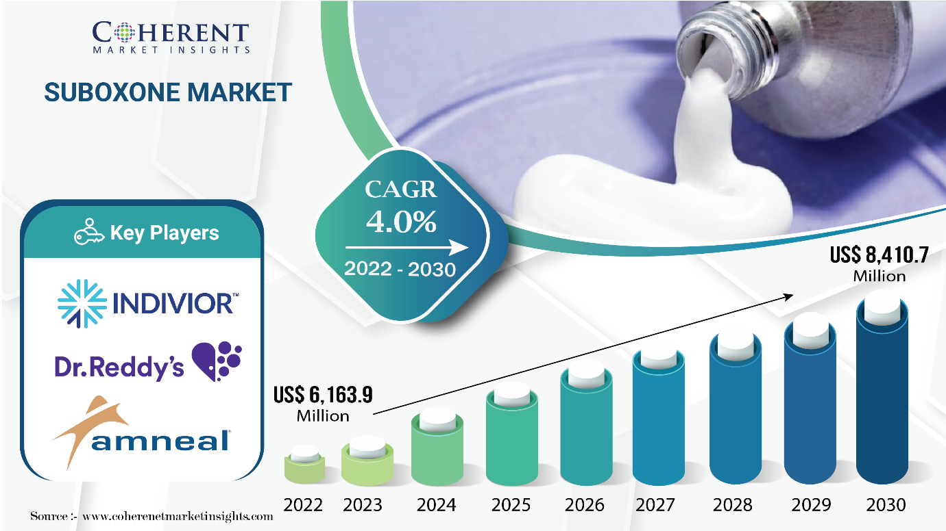 New report by Coherent Market Insights outlines significant trends in global suboxone market. Increasing use of opioids, rising prevalence of chronic and acute pain and increasing approvals and launches for generic versions of suboxone fuels demand for global suboxone market.