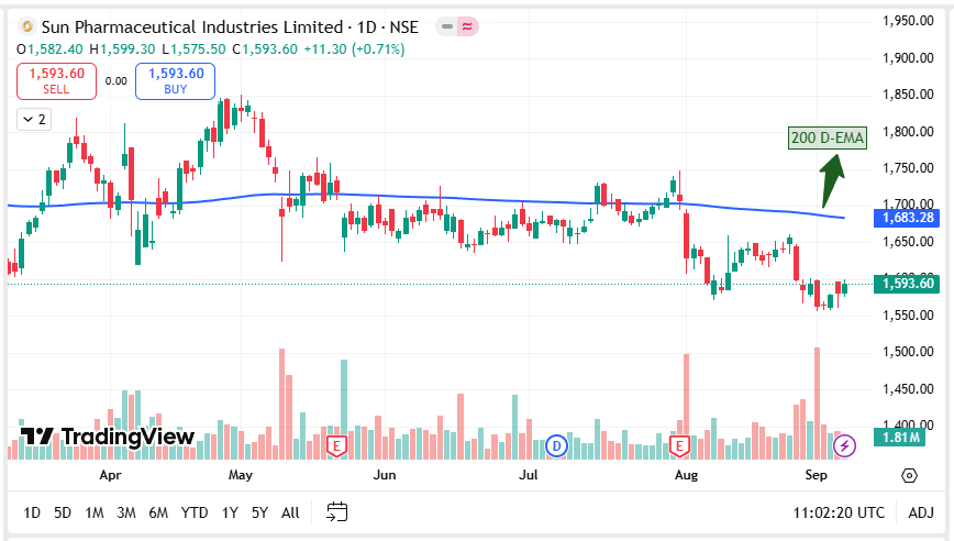 The stock, with a market capitalization of Rs. 3,82,190.07 crore on Friday, closed at Rs. 1,593.60 per share, trading below its 200-day moving average of Rs. 1,683.28. It is currently down 5.25 percent relative to its 200-day moving average.