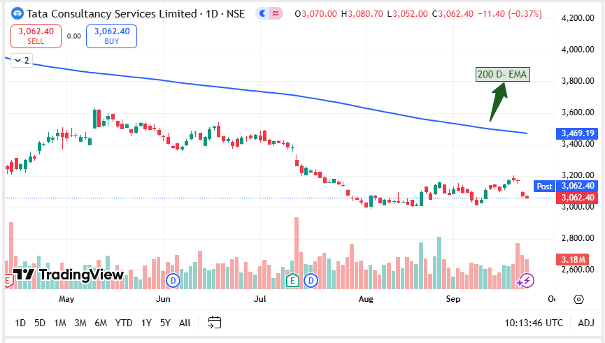 With a market capitalization of Rs. 11,08,943.82 crores on Tuesday, the stock closed at Rs. 3,065 per share, which is below its 200-day moving average of Rs. 3,469.19 in a day’s time frame. The stock is currently down by 11.66 percent from its 200-day moving average.