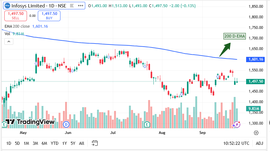 Infosys Limited’s stock closed at Rs. 1,500.60 on Tuesday, with a market capitalization of Rs. 6,23,408.09 crore. It is trading 6.28 percent below its 200-day moving average of Rs. 1,601.16.