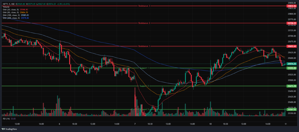 In the afternoon session, the index made its intraday high of 25,653.45 and later lost its momentum and settled above the 25,550 level. Overall, the Index traded within a 25,550-25,650 range throughout the afternoon session. During the afternoon session, the Nifty 50 closed below all four EMAs of 20/50/100/200 in the 15-minute time frame.