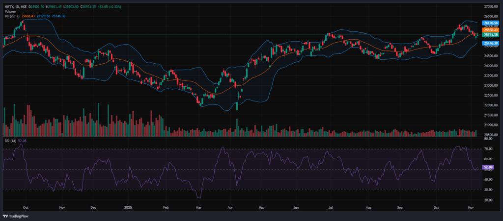 Bollinger Bands (Daily): The index is trading in the lower band of the Bollinger Band range (Simple Moving Average). Its position in the lower range suggests a bearish sentiment, but in the daily time frame on Monday session, the Index ended in a bullish note. The index took support near 25,653, and 25,503 acted as a resistance level. A sustained move above the middle band signals a bullish sentiment, while a drop back toward the lower band may reinforce bearish sentiment.