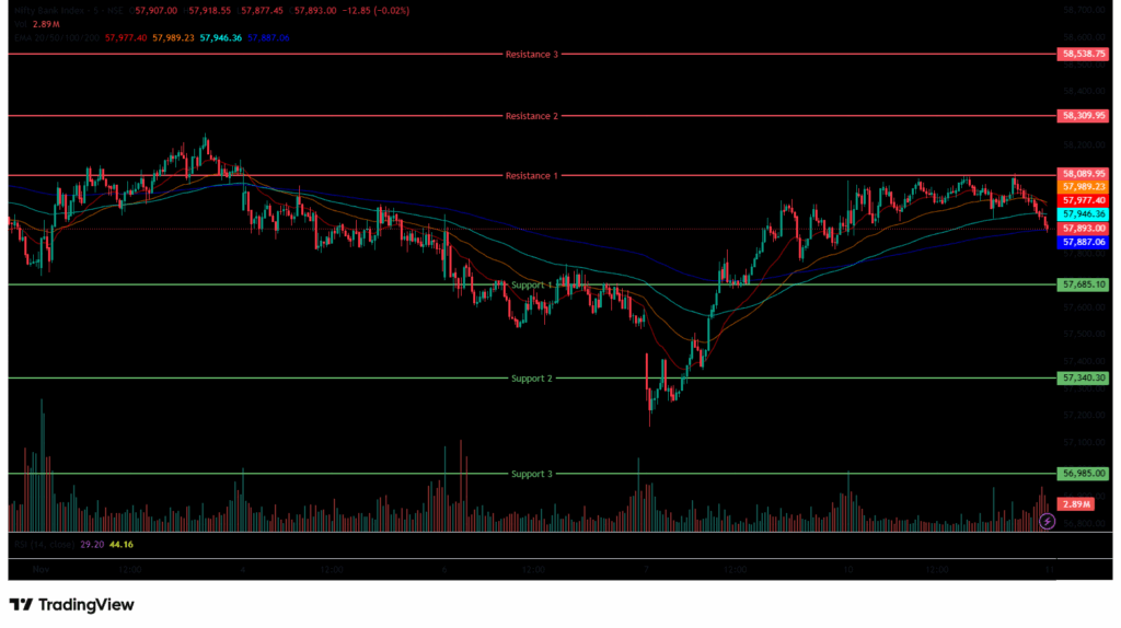 The Bank Nifty Index started the session on a negative note at 57,846.20 on Monday, down by 30.6 points from Friday’s closing of 57,876.80. The index started on a Bearish note, but later, it moved upwards and was trading within the 57,800-58,100 range and was trading above all four EMAs of 20/50/100/200 in the 15-minute time frame in the morning session.