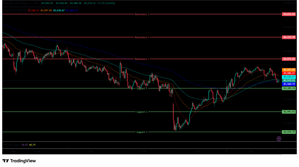 The BSE Sensex Index opened on a negative note at 83,198.20 on Monday, down by 18.08 points from Friday’s closing of 83,216.28. The index started its session on a bearish note, but later, it moved upwards and was trading within the 83,150-83,750 range. It traded above the EMAs of 20/50/100 but below the 200-day EMA in the 15-minute time frame in the morning session.