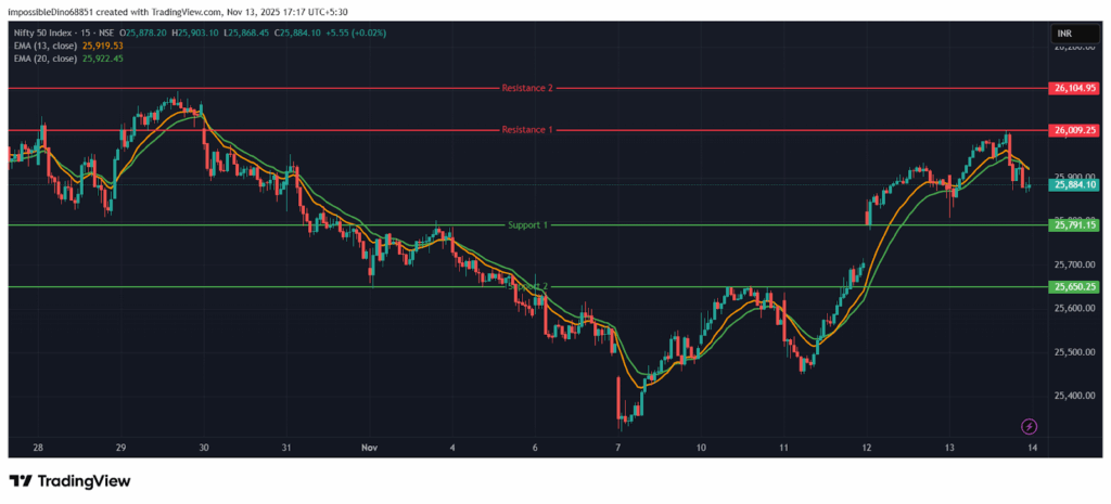 In this overview, we will analyse the key technical levels and trend directions for Nifty and BSE Sensex to monitor in the upcoming trading sessions. All the charts mentioned below are based on the 15-minute timeframe.