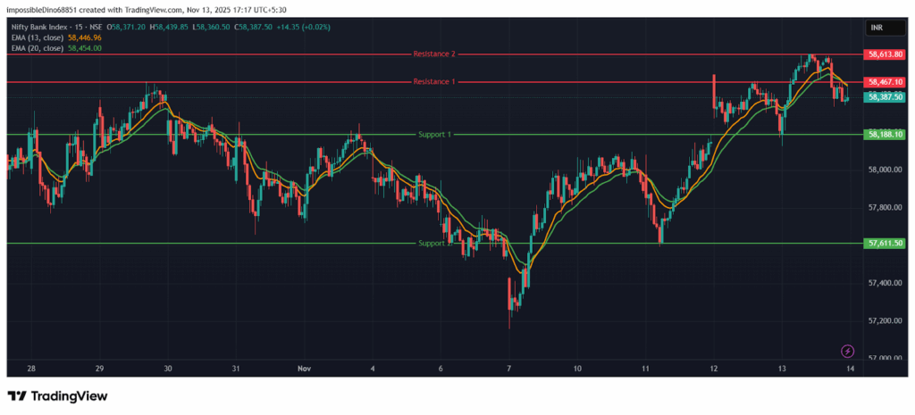 The Bank Nifty Index opened on a negative note at 58,158.75 on Thursday, down by 115.89 points from Wednesday’s closing of 58,274.65. The index opened on a negative note on Thursday; however, in the morning session, it continued to rally, trading between the 58,200 and 58,600 levels. In the afternoon session, the index, however, continued to decline and traded between the range of 58,380 and 58,600.