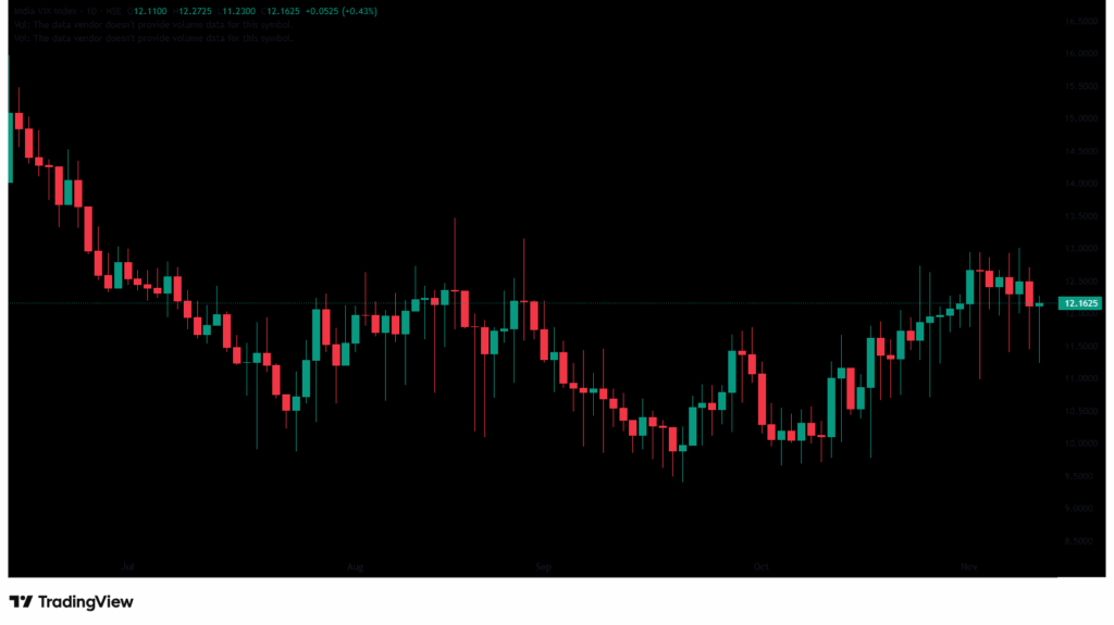 The India VIX increased 0.053 points or 0.43%, from 12.11 to 12.16 during Thursday’s session. An increase in the India VIX typically indicates higher price volatility in the stock market, suggesting a less stable market environment. However, a stable market environment and minimal volatility are anticipated when the India VIX is below 15.