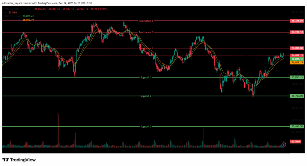 The Nifty 50’s nearest resistance levels are at 26,098 (R1) and 26,230.10 (R2), and a higher resistance at 26,325.80 (R3), which is the all-time high for the index. On the other hand, the closest support is now at 25,855.15 (S1), and the next one at 25,700 (S2), which were previous resistances now acting as support. If the index falls below this, the next strong support level to watch is at 25,446.50 (S3).
